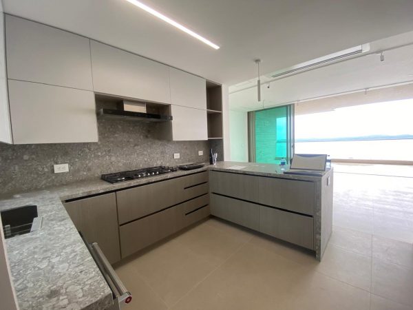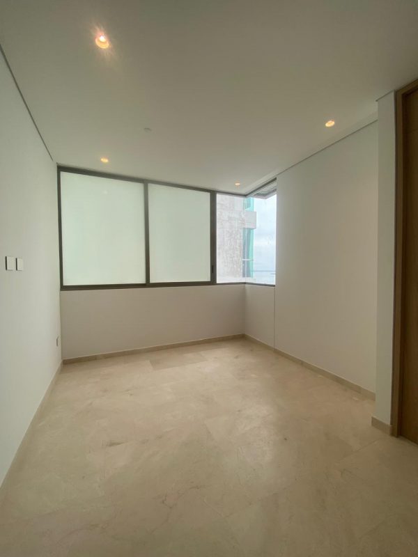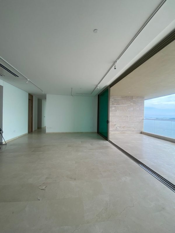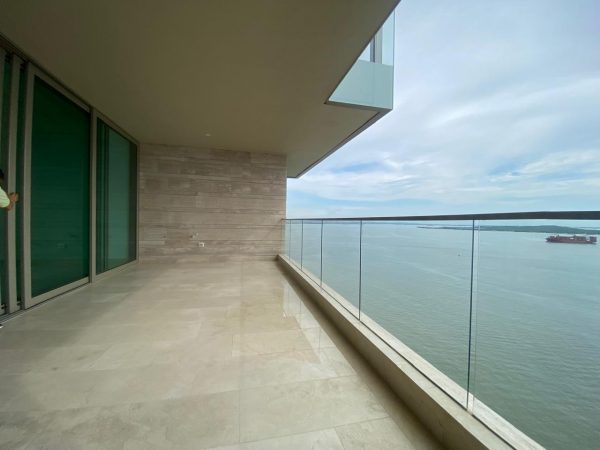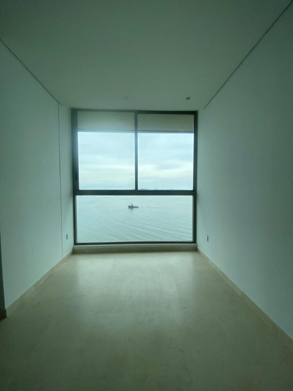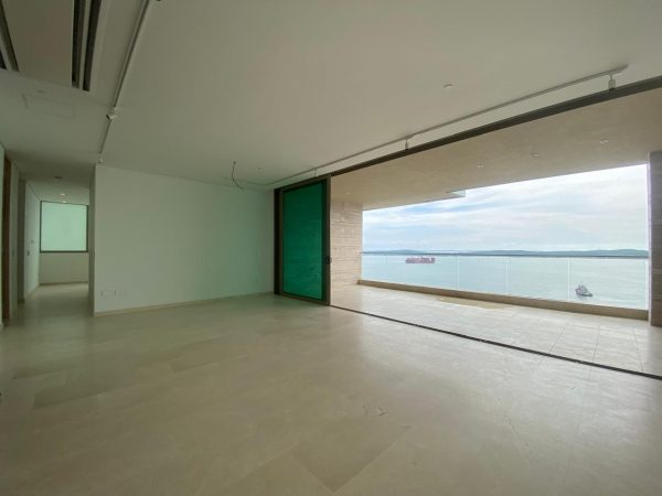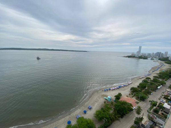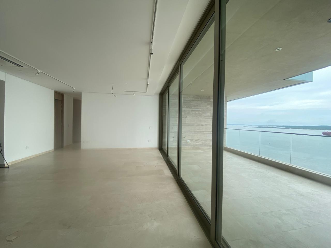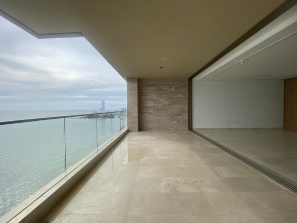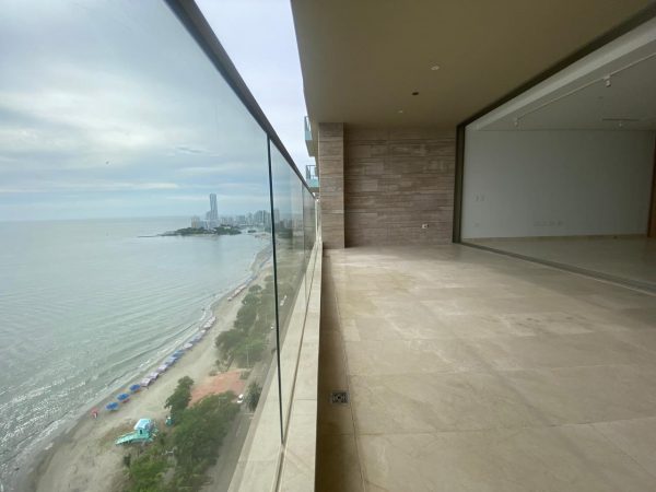 Apartamento de lujo para estrenar frente al mar, con vistas inigualables al mar y la Isla de Tierra Bomba, a pocos pasos de la playa y del paseo peatonal de la bahía. Consta de balcón con vista directa a la playa, tres modernas alcobas con baño interno, sala amplia, comedor, cocina equipada con los mejores electrodomésticos, con lavavajillas, baño social, cuarto y baño del servicio, zona de labores, pisos en mármol, 2 parqueaderos y depósito.
