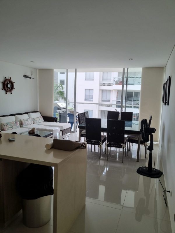 Terraza con vista hermosa, tres alcobas, dos baños, sala comedor, cocina tipo integral, puertas de seguridad, espacio para sala de tv o oficina, área de labores, dos garajes y una bodega grande, aires en las habitaciones y cortinas, sala con cortina eléctrica. Conjunto residencial tranquilo y seguro con hermosas amenidades, piscinas , cuarto juegos, turco, sauna, zona BBQ, media cancha múltiple , hermosa vegetación, portería 24h, vigilancia externa, hermoso y protegido entorno, al lado de la clínica Serena Del Mar ( Fundación Santafé) y Universidad de Los Andes , parques y próxima zona de comercio y club de golf, a pocos minutos del centro histórico y el Aeropuerto Internacional Rafael Núñez de Cartagena.